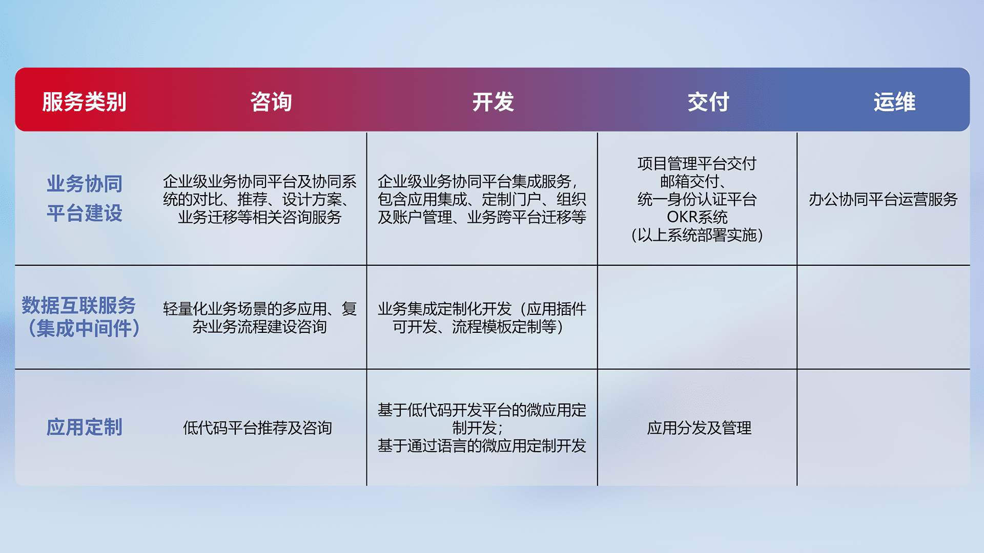 针对钉钉、、、、企微、、、、IDaas等平台级产品提供产品的规划、、、、方案、、、、交付、、定制化开发等服务,,,,实现如统一协同办公、、智能客户服务、、混合会议管理、、、智能数据查询、、、、等业务场景,,,,实现数字化转型。。。