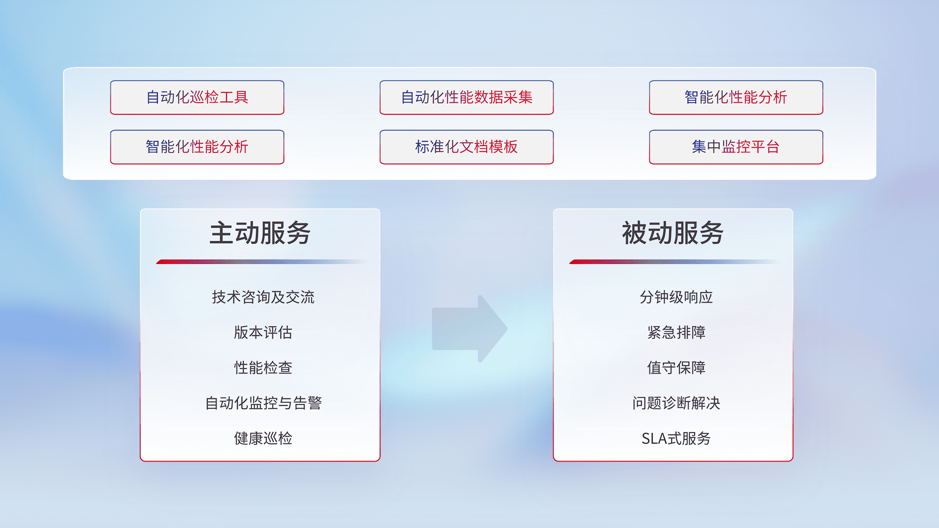 智能化工具和标准化文档,,,,保障服务质量,,,提供主动服务(包含技术咨询、、、版本评估、、、、性能检查、、、自动化监控与告警、、、、健康巡检)和被动服务包含(分钟级响应、、紧急排障、、、、值守保障、、、问题诊断解决、、、SLA服务)。。。。